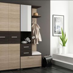 Прихожая компактна, занимает немного места. Прихожая содержит все элементы, необходимые для создания комфорта во входной зоне.